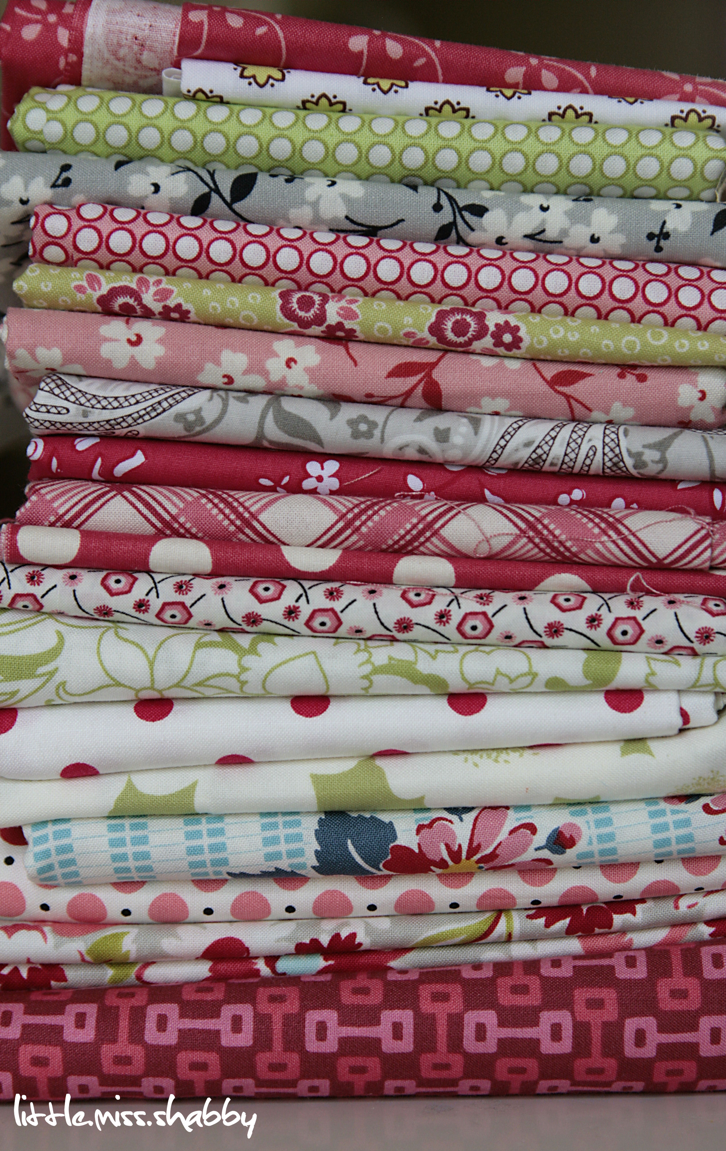 A little tip: If you are ever unsure of how a stack of fabric mixes, take a picture and look at it on your computer screen–you get a different perspective that you don’t get when you see it in person. I don’t know how many times I have snapped a picture of a stack of fabric and then changed things around after seeing it on the computer–it really does help to get that 2nd perspective. =)